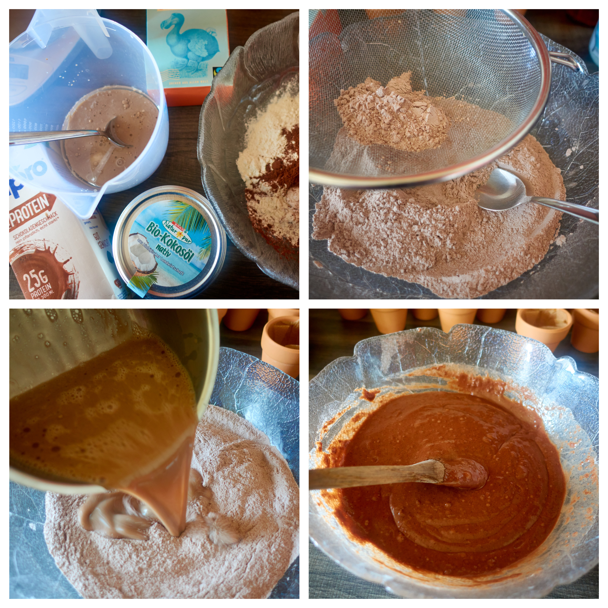 Add the chocolate drink, melted coconut oil and vanilla extract to the dry ingredients and mix to a smooth dough.