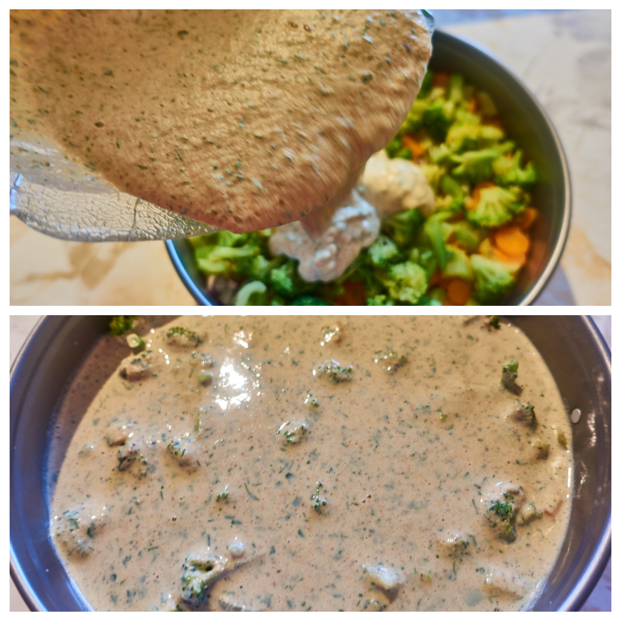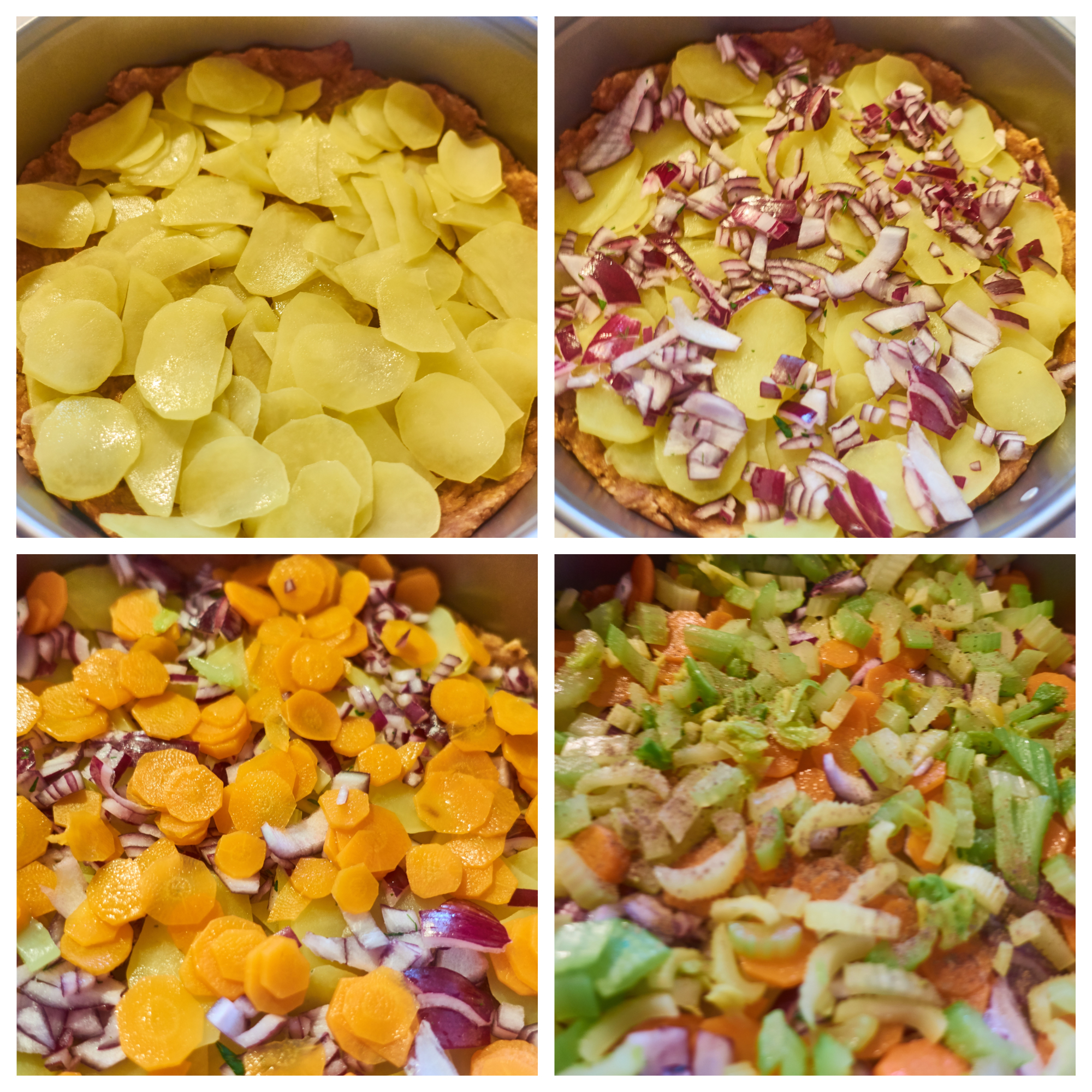 Now top the dough with the potatoes, onions, carrots, celery and finally with the broccoli.