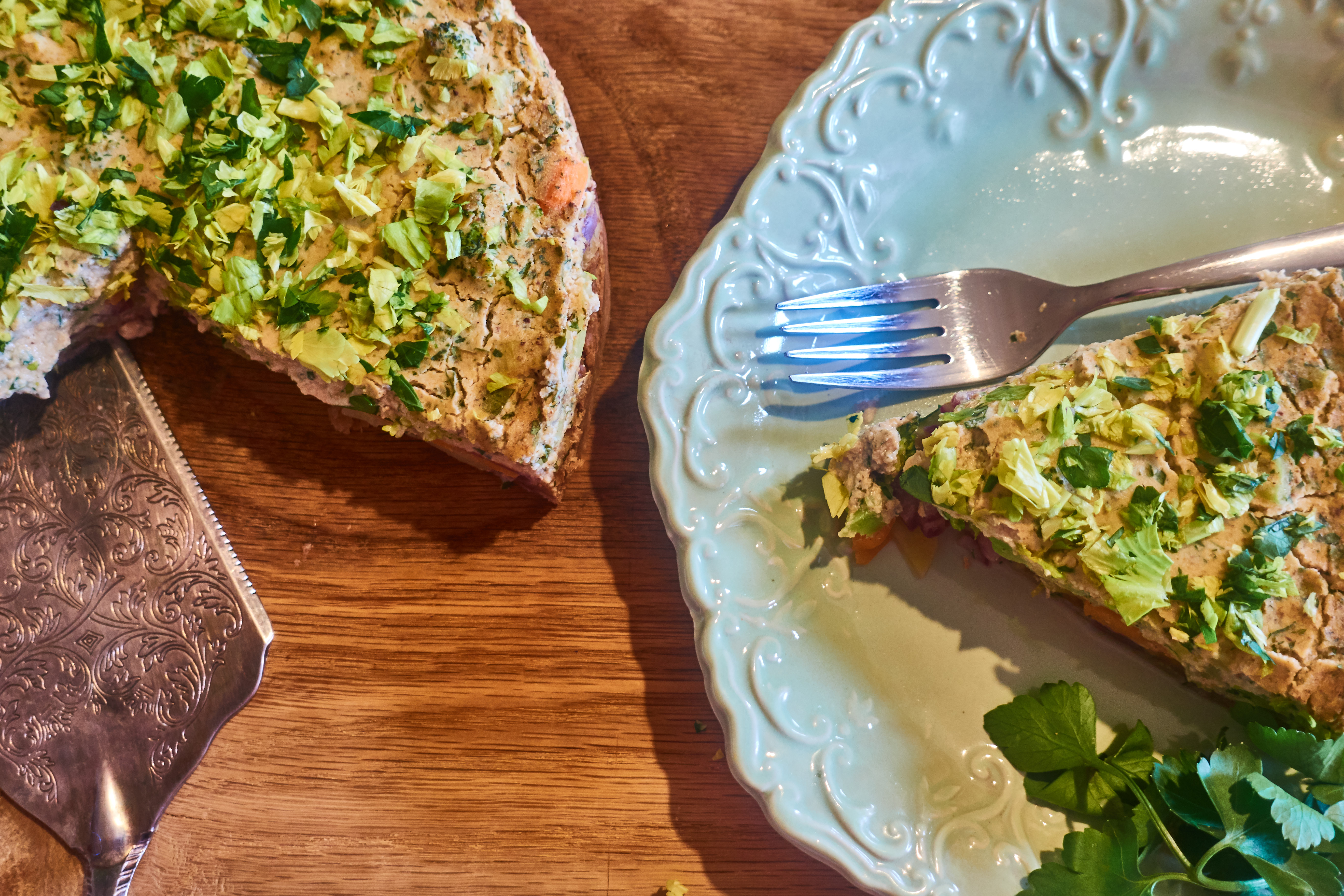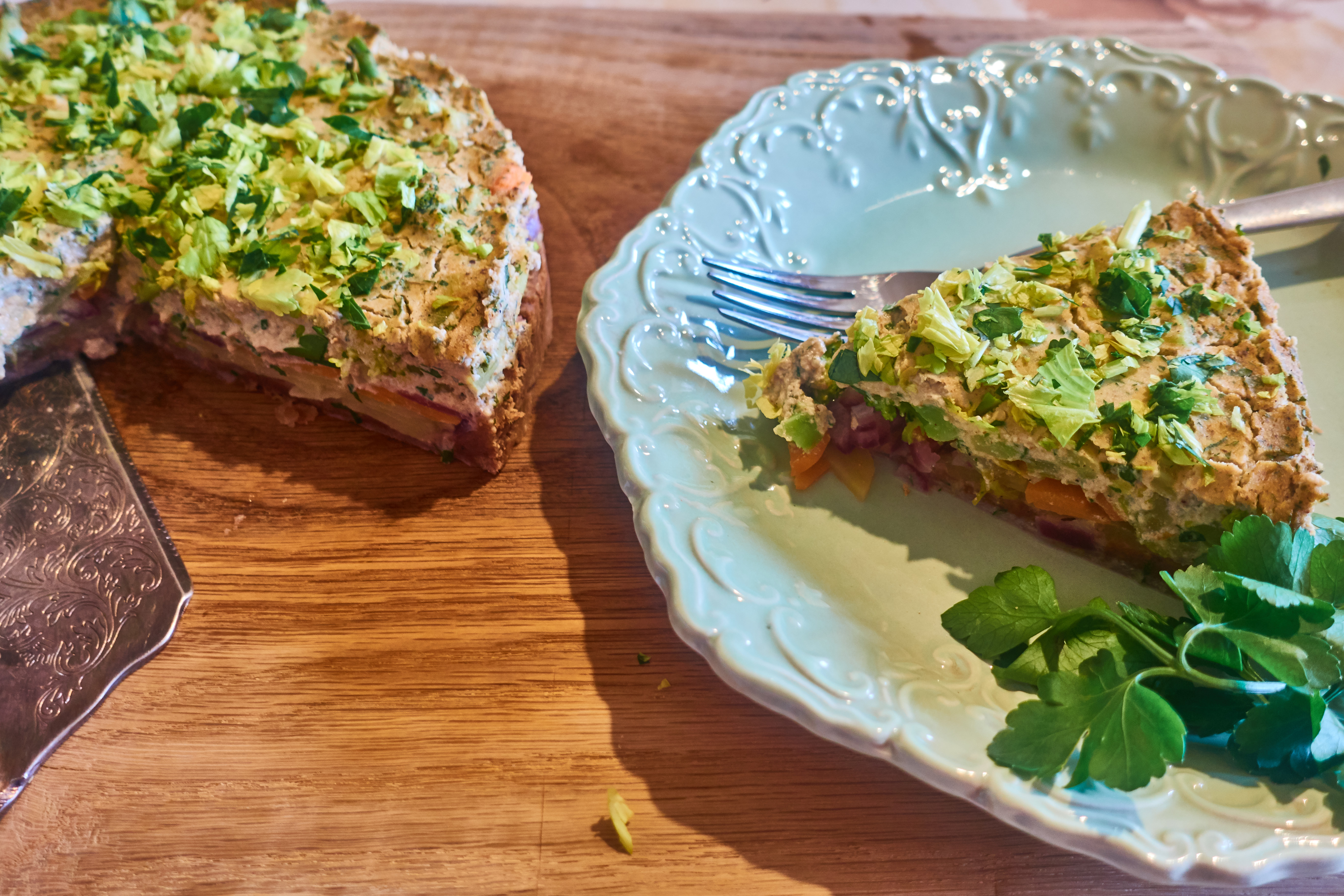 Bake the quiche at 170 ° C for about 25-30 minutes. Sprinkle the quiche with chopped parsley and celery leaves and serve.