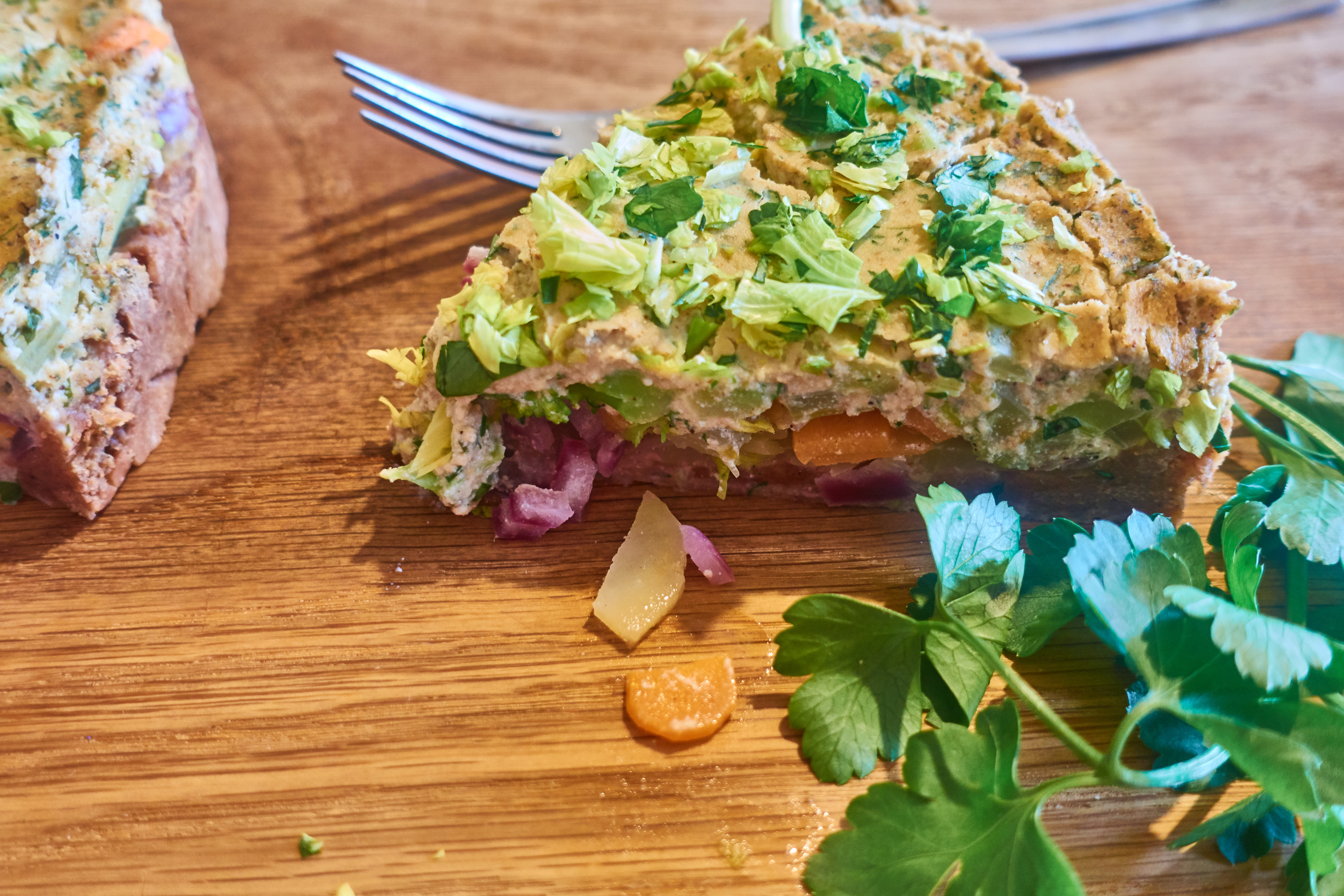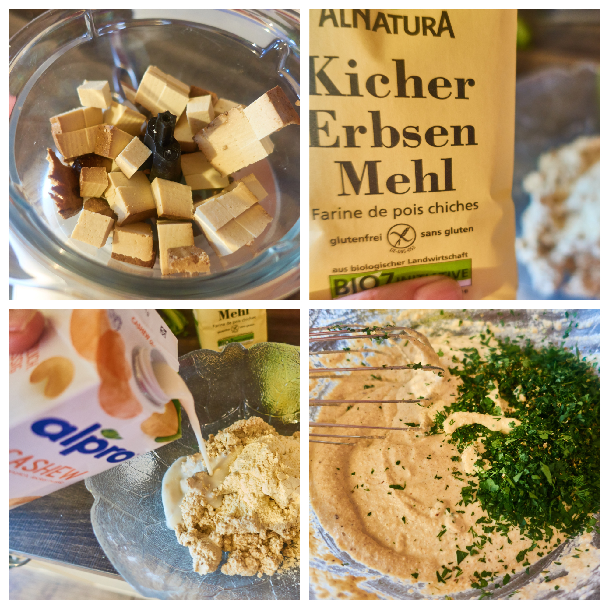 For the topping, puree the tofu finely, stir in the chickpea flour and so much cashew milk until the mixture is viscous, add the finely chopped herbs and season with salt and pepper.