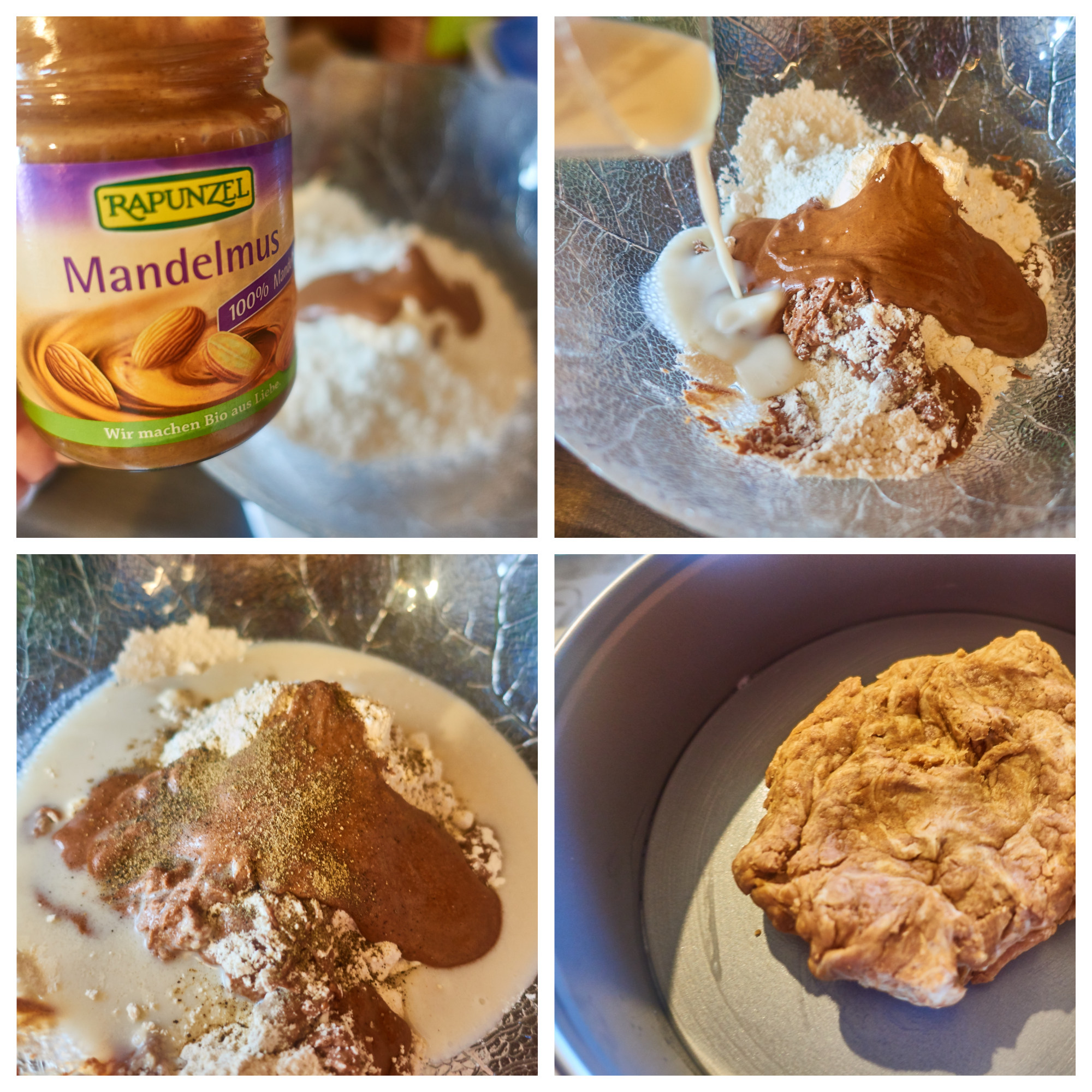 Knead the spelled flour, almond butter, solt, pepper and cashew milk into a dough.