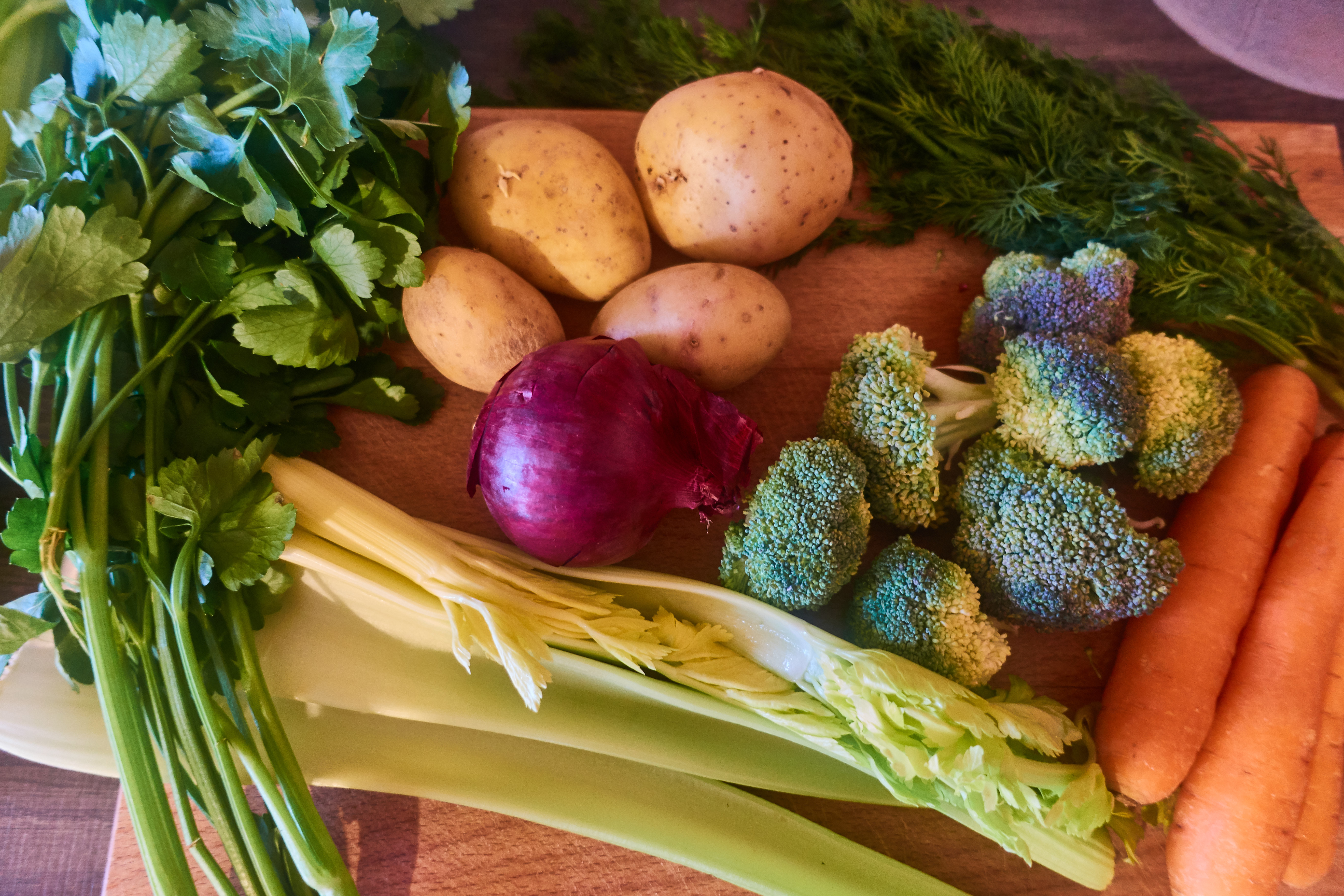 Cut the potatoes and carrots into thin slices and the celery into small pieces., chop the onion finely, cut the broccoli into small florets.