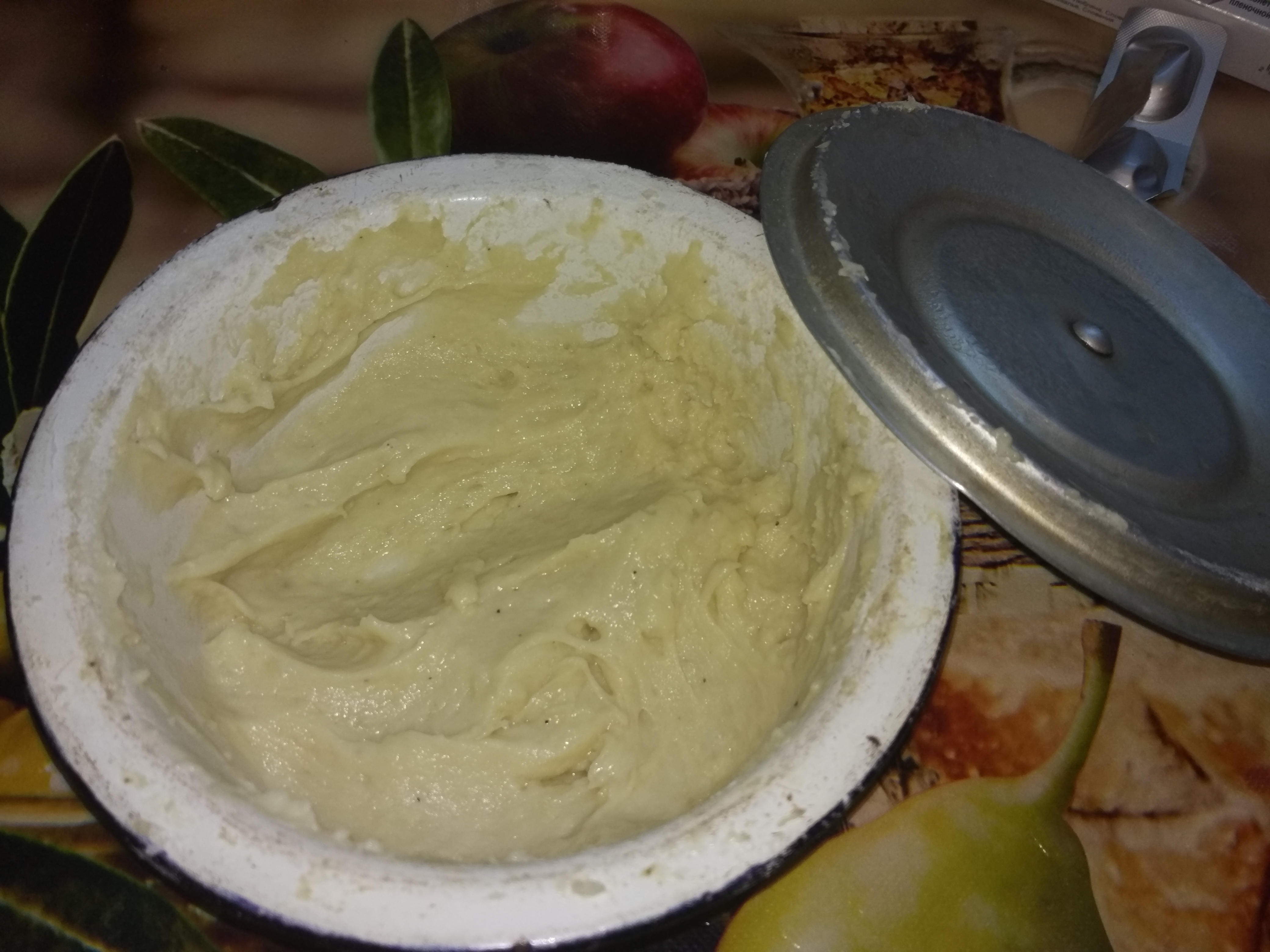 После всех этих манипуляций пришло время заваривать пюре. Вот здесь то и возникли основные сложности. Самое главное не переборщить с водой, так как в этот "фарш" ещё будет добавляться сметана, и он может стать слишком жидкий. Ну так вот, заварив пюре я добавил туда предварительно обжаренный лук, сливочное масло, соль, перец, сырое яйцо и 2 ложки сметаны, после добавления которой моё "тесто" стало неприлично жидким.