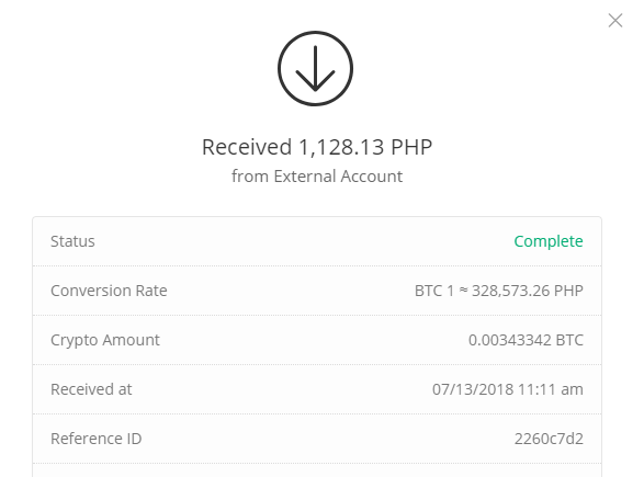 From there, the transfer went to coins.ph and was converted to 1,128.13 PHP.