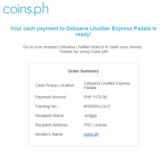 From coins.ph, we sent 1,170 PHP to Cebuana Lhuillier Express Padala.