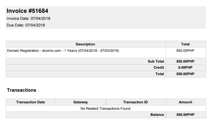 From Cebuana, we also paid the 550.00 PHP amount to ICONCEPT Global Advertising, Inc for the domain registration of dcomix.com for 1 Year (07/04/2018 - 07/03/2019).