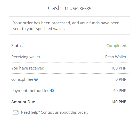 Before the cash out, we made a cash in amount of 100 PHP to coins.ph with a payment method fee of 40 PHP, so the total amount is 140 PHP.
