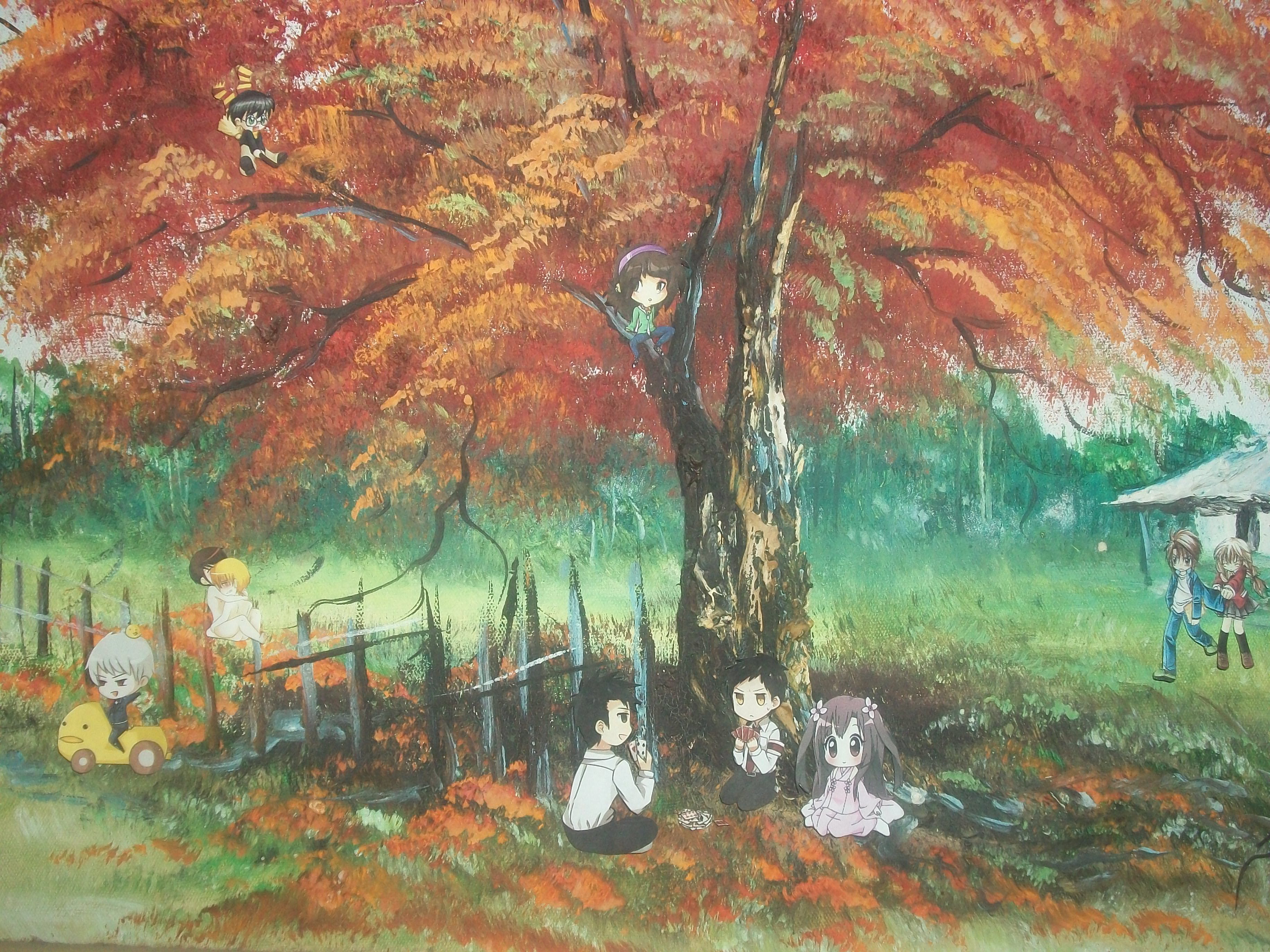 Forma parte de una tarea de fotografía, donde debíamos de hacer una composición de forma que crearamos una falsa realidad, no sé si me explico. En este caso, busqué chibis anime (esas versiones pequeñas de un peraonaje), las imprimi, recorte, y pegue sobre una pintura de un paisaje, hecho ya en el año 1993, de modo de hacer una escena divertida jajajaja