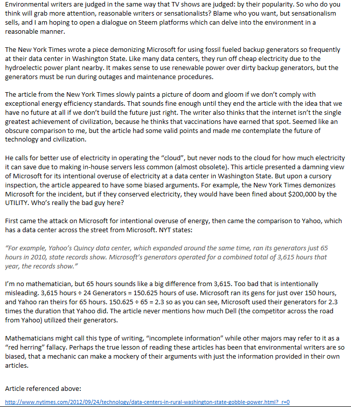 He calls for better use of electricity in operating the “cloud”, but never nods to the cloud for how much electricity it can save due to making in-house servers less common (almost obsolete). This article presented a damning view of Microsoft for its intentional overuse of electricity at a data center in Washington State. But upon a cursory inspection, the article appeared to have some biased arguments. For example, the New York Times demonizes Microsoft for the incident, but if they conserved electricity, they would have been fined about $200,000 by the UTILITY. Who’s really the bad guy here?