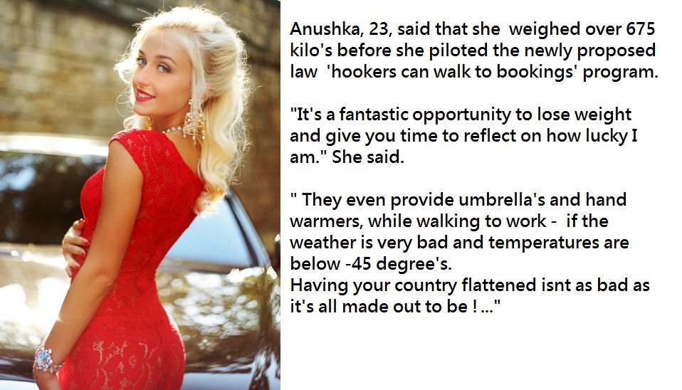 "It's a win, win for everyone, really", Said one elite. "Not only does it ensure that the Ukranian beauties stay in shape for their job, but the 30 km walk to the bookings gives them the time to reflect on just how lucky they are to be living in the land of the free - and not being a limousine puller.