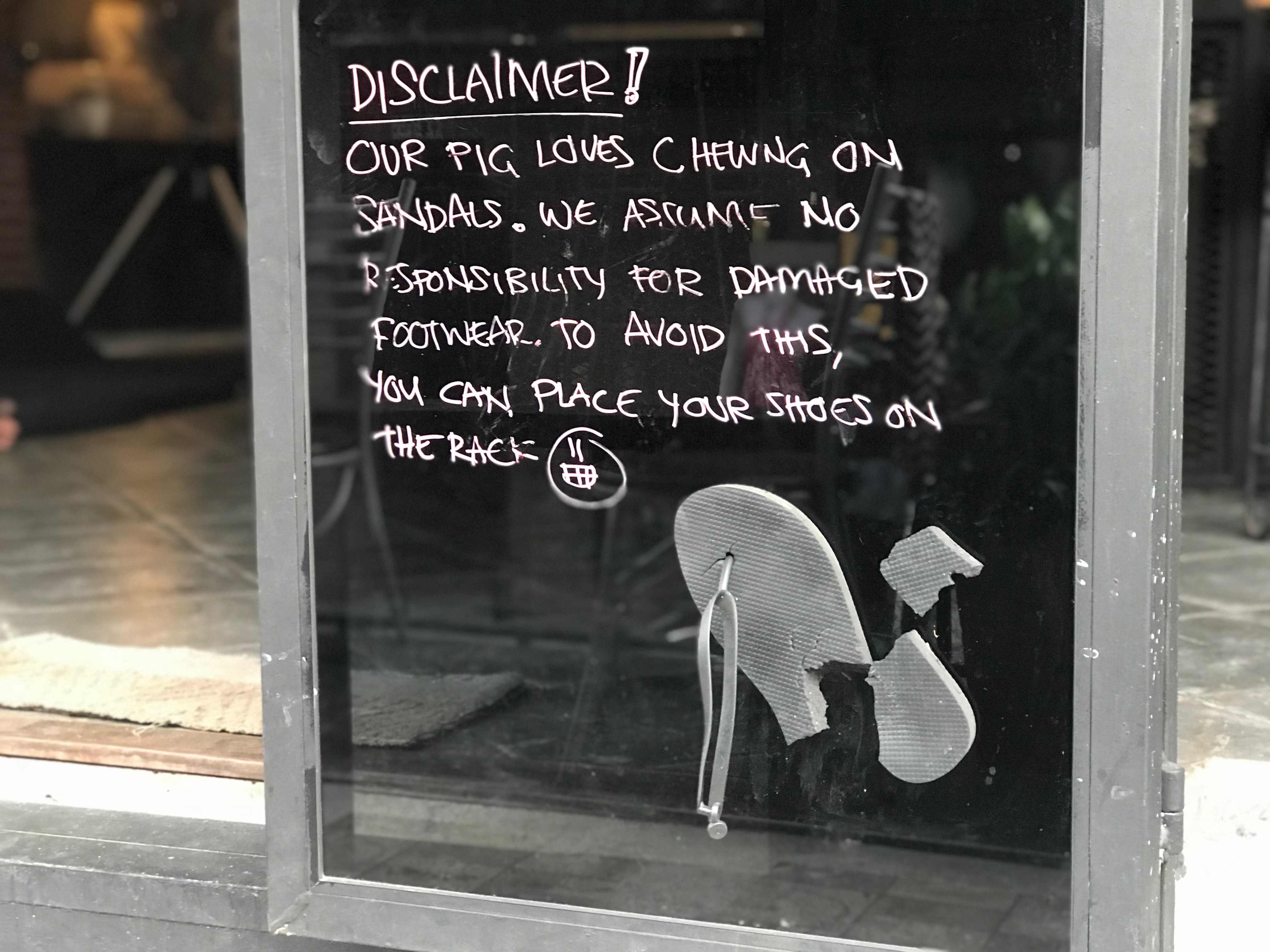 Once on Koh Tao Island (Thailand) I regularly visited a nice coffee shop before going to the beach. The coffee shop had the characteristic: visitors should take off their shoes before entering (it's usual for Thailand small shops, pharmacies, café when people take off shoes before entering), BUT they are strongly advised to take care of their footwear.