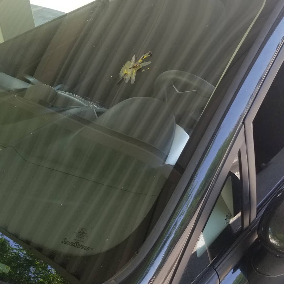 A large dragonfly bug hit my windshield. Is it real or fake? Is it just a disgusting bug that wanted to gross everyone out by splattering itself on my windshield? Or did I find an already dead dragonfly, squirt mustard on my windshield, chop up the body parts and stick them to the mustard for something to post on the internet?