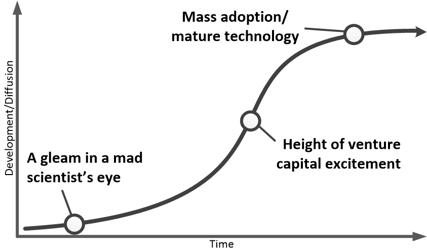 It is a tough art to do well. The closer you are to the far left of the graph the farther ahead you can potentially see; however, the uncertainty here is high. Many techs and practices fizzle out before they go anywhere. For this post most of the weak signals we are dealing with are pretty close, if not on, to the point marked height of venture capital excitement. This gives us better plausibility but also places us fairly close to the "present."