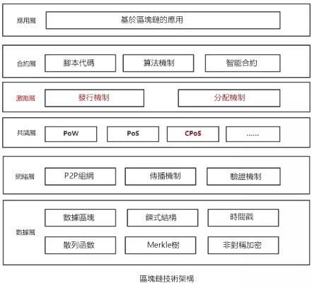 在區塊鏈的技術架構中,激勵機制處於激勵層,處於共識層和應用層之間,與共識機制是強關聯關係,共識機制幾乎決定了激勵機制(如圖)。
