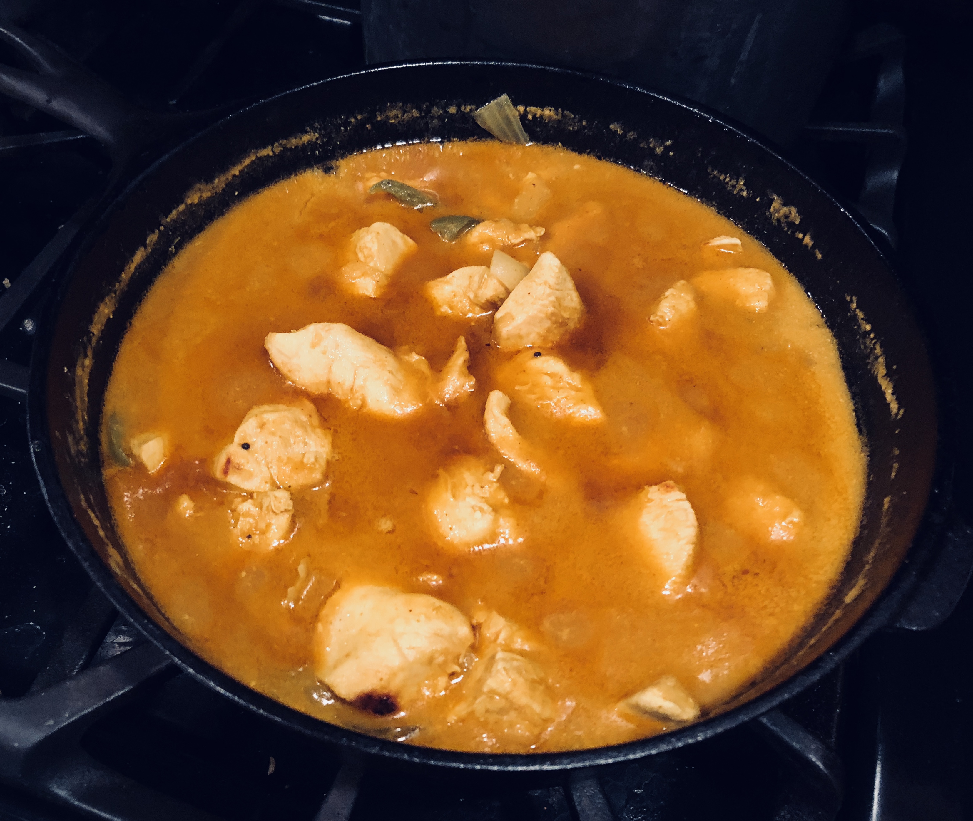 - Once you've satisfactorily browned your chicken, add coconut milk (I used 1 can of milk)