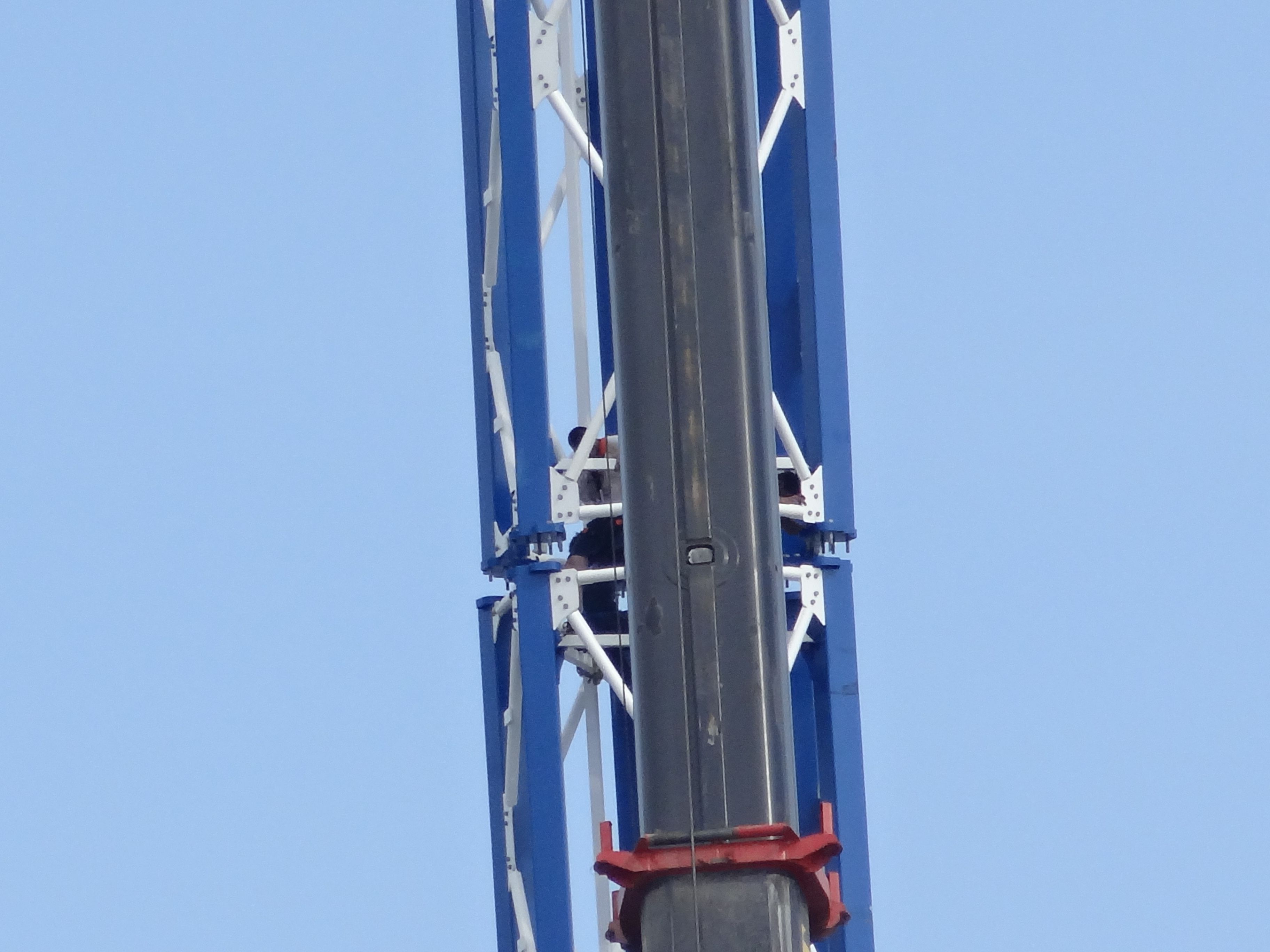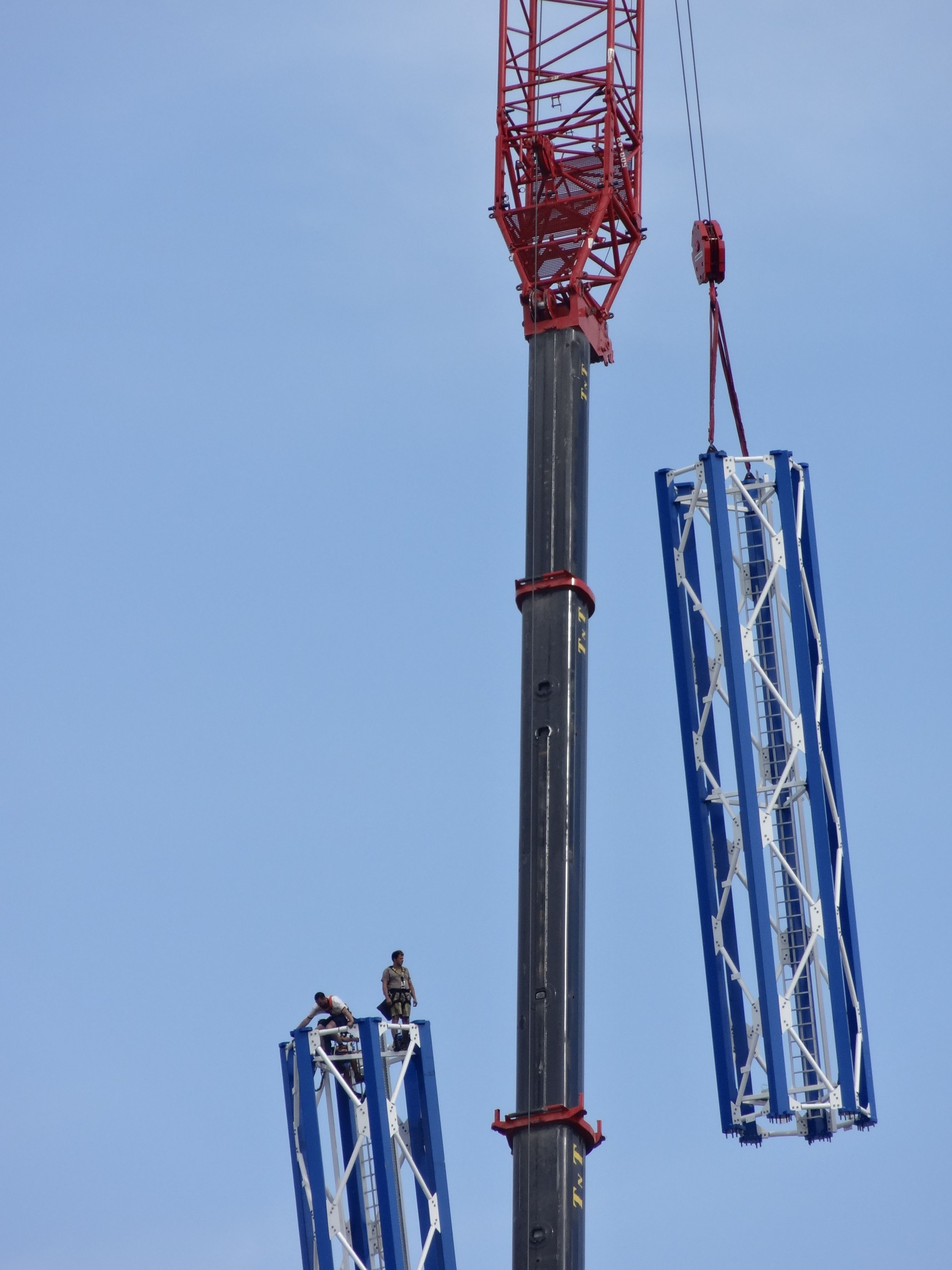 Pleasure Pier on Galveston Island is a small amusement park that opened in 2012. The original Pleasure Pier was destroyed by Hurricane Carla in 1961. I was visiting Galveston during the 2012 construction and watched as a crew worked to set a piece of one of the rides.