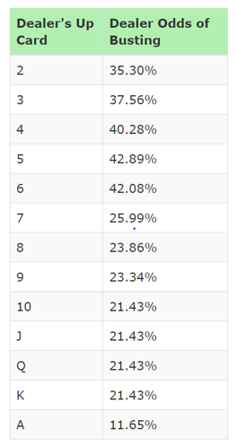 According to basic Blackjack strategy Soft hands more often allow you to make double when DEALER in a “trouble”. The situations when DEALER has “4” , “5” or “6” face up card being called “dealer trouble situations”. Because there are biggest probability of being bursting for the dealer with this cards. The exactly dealer’s odds of bursting at the below table: