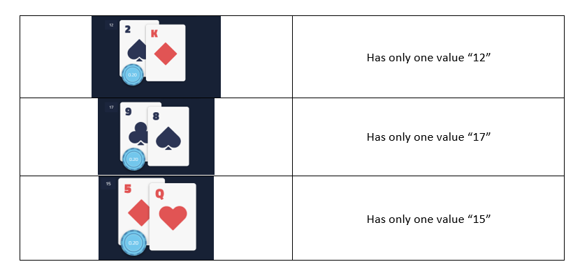 Hard Hand is any two-card total which doesn’t include “Ace”.