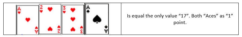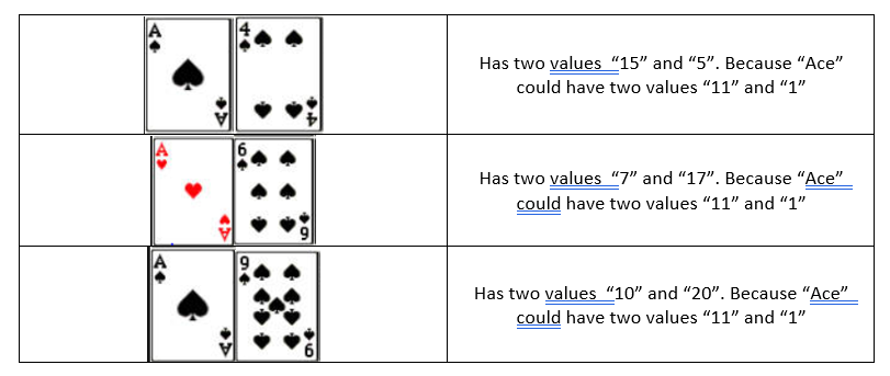 As far as you know, points for each cards are equal to the face value of that card. Points of Pictured cards are equal “10”. And points for the “Ace” are equal “11” , but at the same time points for “Ace” could be equal “1”. That’s the only exception when card has two value points. That’s why there are two types of PLAYER’s hands: