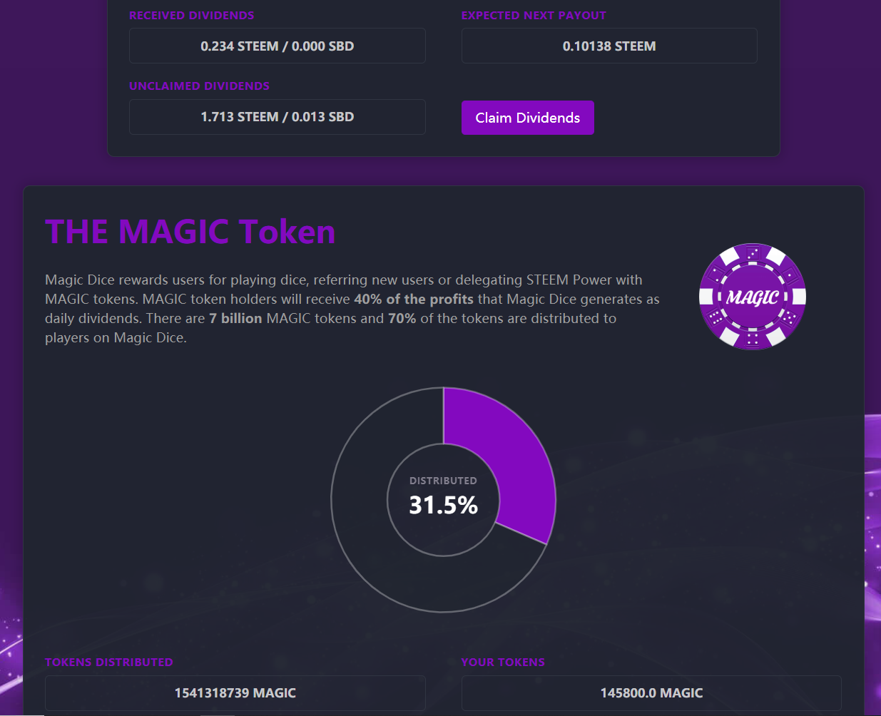 In this way, on November 26th 2018, a STEEM Casino dApp was born called MagicDice. From technical stand point, there are some key-differences, whereas the STEEM BlockChain doesn't provide Smart Contracts; but from Users' stand point -- everything is pretty much the same. Except, of course, one thing; one big thing!