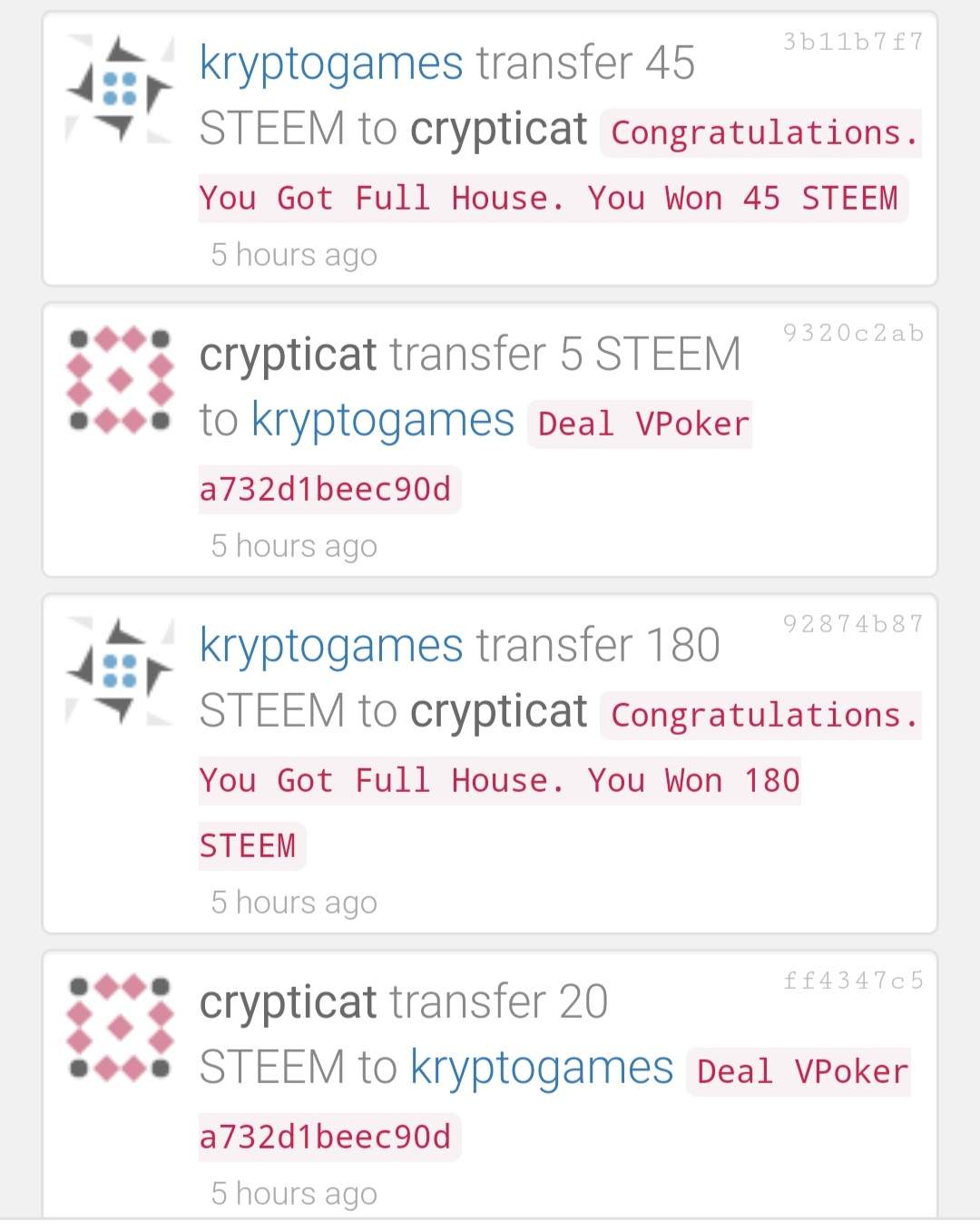 * Please note you do not have to key in [] for the command to work, APR can be affected by STEEM pricesThank you so much @fairbet for delving into fairness for our platform kryptogamers and explaining the minute details of our fairness algorithm in very simple terms. Regarding skipping nonces or steem transaction id, no result or card sequence is generated without taking the third parameter "Steem transaction ID" into equation as that is the base of our open-source algorithm of all our games. Anybody who believes differently is welcome to verify any transaction for this.