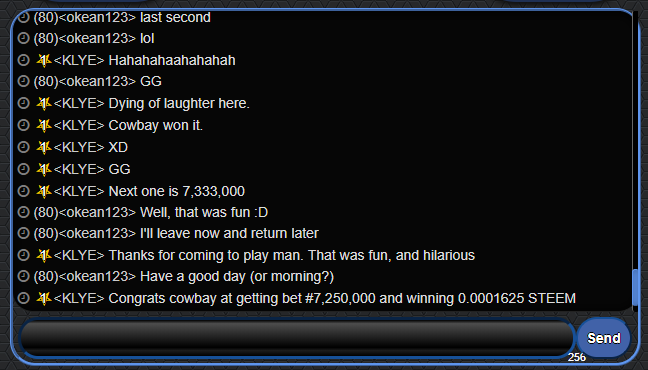 It's to be noted that user @okean123 was also rolling at about 12 bets per a second for the prize however busted his STEEM bankroll about 500 rolls before the milestone came up but was lucky enough to reload his balance and try again. Unfortunately for him even with his incredibly fast roll speed @cowbay got lucky and hit the 7,250,000th bet. Was certainly fun to watch.