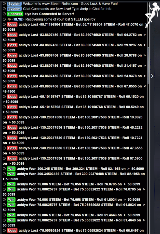 Tonight's gambling session by @acidyo was certainly an interesting spectacle to watch with the swing of luck making for an exciting, butt puckering experience ending up with some people losing, some people winning and ultimately some mixing / changing hands of some STEEM between people. it is quite exciting for both the investors and the gamblers to see action like this on the site. Folks on STEEM are welcome to come try out the site which can be rolled on for free via claiming the faucet on site or by depositing some STEEM to the @steem-rollerd account with their Steem-Roller.com username AFTER they have registered an account on the site.