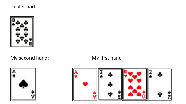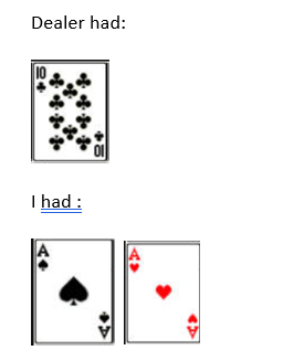 So, Dealer had “10” and I had “12” or “2”. For me, two Aces on the hand one of the worst Blackjack’s situation, especially against dealer’s 10. Dealer’s “10” points hand is the strongest hand, more stronger than “Ace”. Only one thing I was sure that Dealer have not got immediately natural Blackjack. Because according to Edgeless Casino rules Dealer must immediately show his blackjack and announcing your loose.