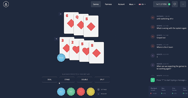After first dealt card Edgeless dealer received “4” and “7” and was very lucky not to burst and beat Player , who had very good chances to win.