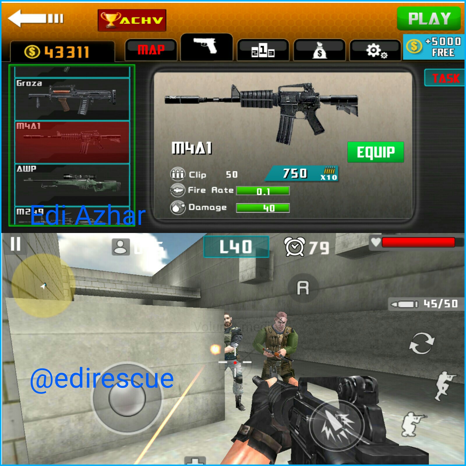 di sadari bisa terjadi kapan pun, maka itu pada permainan ini di butuhkan startegi dan tehnik untuk menghadapi musuh yang gesit dan pandai di dalam menyerang, maka itu untuk menyerang dan menembak musuh dalam permainan Gun Strike War Shoot ini, saya mrngunakan senjata jenis M4A1 karena dengan tive atau jenis senjata ini yang saya gunakan di dalam permainan Gun Strike War Shoot ini, mudah untuk nenghadapi musuh dan juga mengabisi semua musuh-musuh yang ada pada permainan Gun Strike War Shoot yang saya mainkan ini. Sahabat steemit ini cerita dan pembahasan saya di hari ini pada permainan Gun Strike War Shoot ini apabila ada kesalahan di dalam saat saya mengegetik dan memberi penjelasan, silahkan Kritik dan membiri saran pada kolom Comment, salam game gun strike war shoot dan salam Steemit.