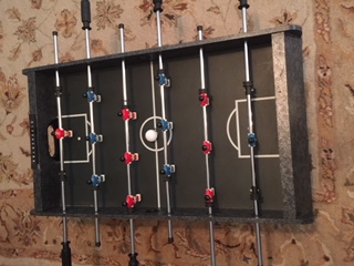 Our music teacher/church canter is leaving soon to go work somewhere else and they gave their Foosball table to us, so we now have a new game to play. I am the best at it of course, except for my older brother who is barely better than me. It is not a very big one it is a small version. My sister has had some weird ideas lately. Just recently she just suggested that we play it with our feet, my younger brother said that he would play normal and she could play with her feet. Surprisingly she won!