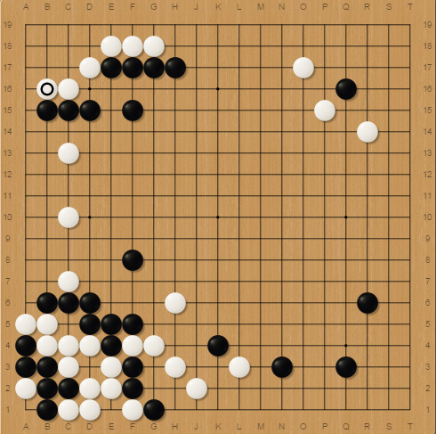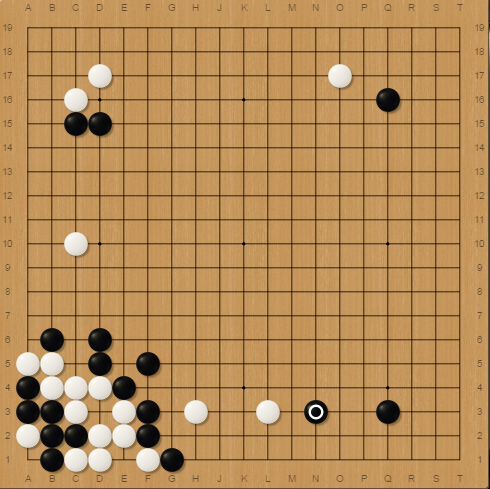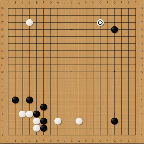 He pincered me with H3, I jumped out and enclosed him in the corner. Then he played O17 but I didn't respond to him, I wanted to play the shape point on C2 !