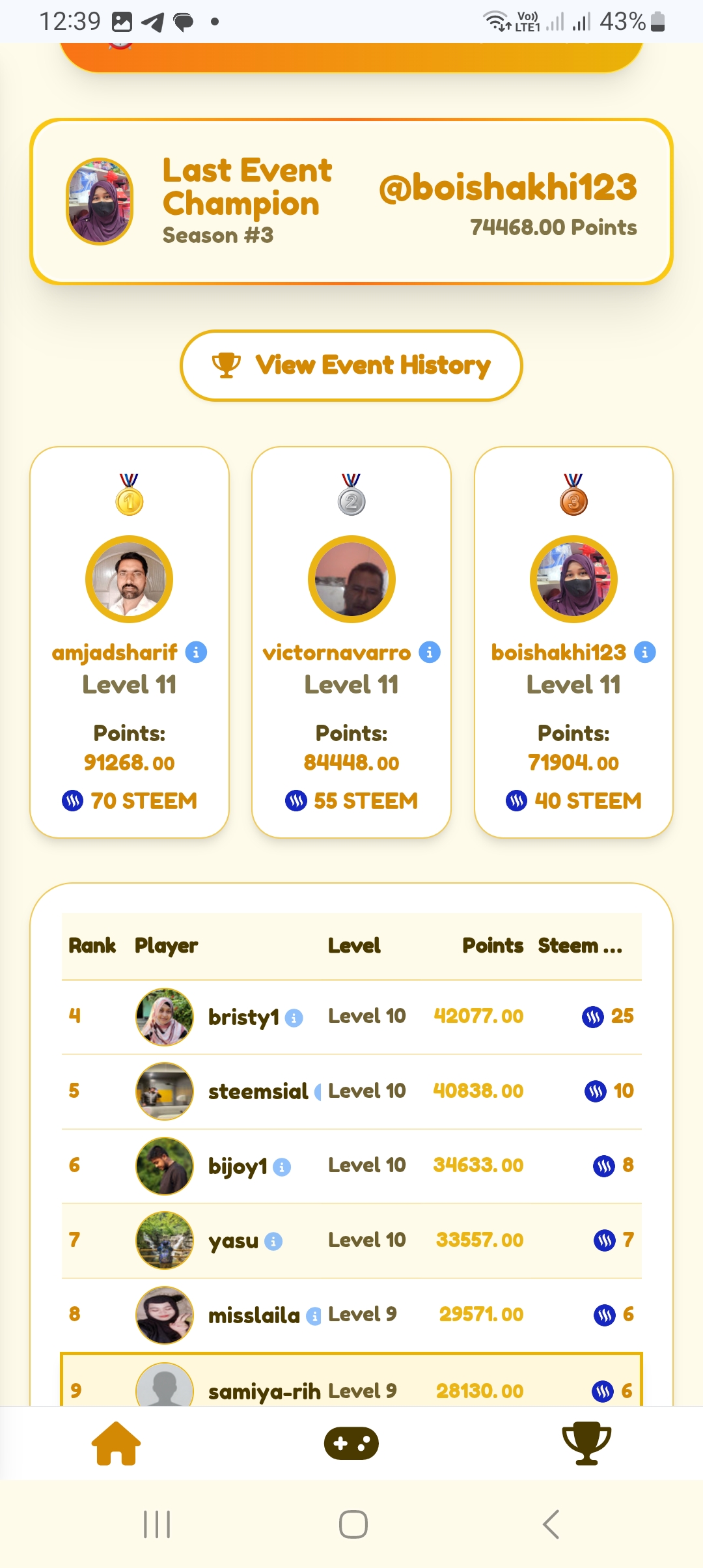 Then I clicked on the leaderboard option. There are some good players on the leaderboard. Also, there is a timer here. The time is more than a day. Also, among the good players here, @amjadsharif is in first place, @victornavarro is in second place and @boishakhi123 is in third place.
