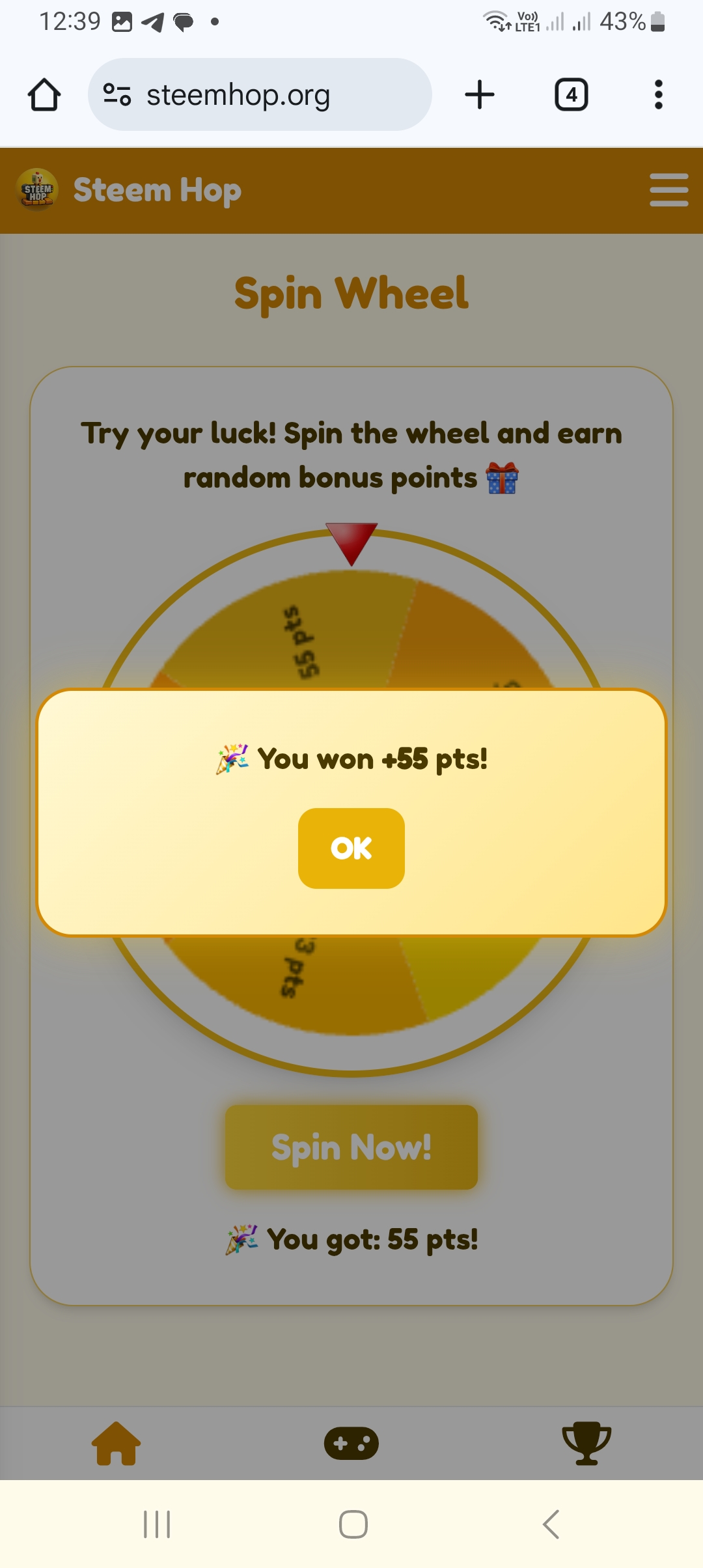 Then I first clicked on the spin hoyel option to spin and then clicked on spin now. After clicking on spin now, the board turned around for a while and stopped at this option of 55 pts. And this was added to my total points.
