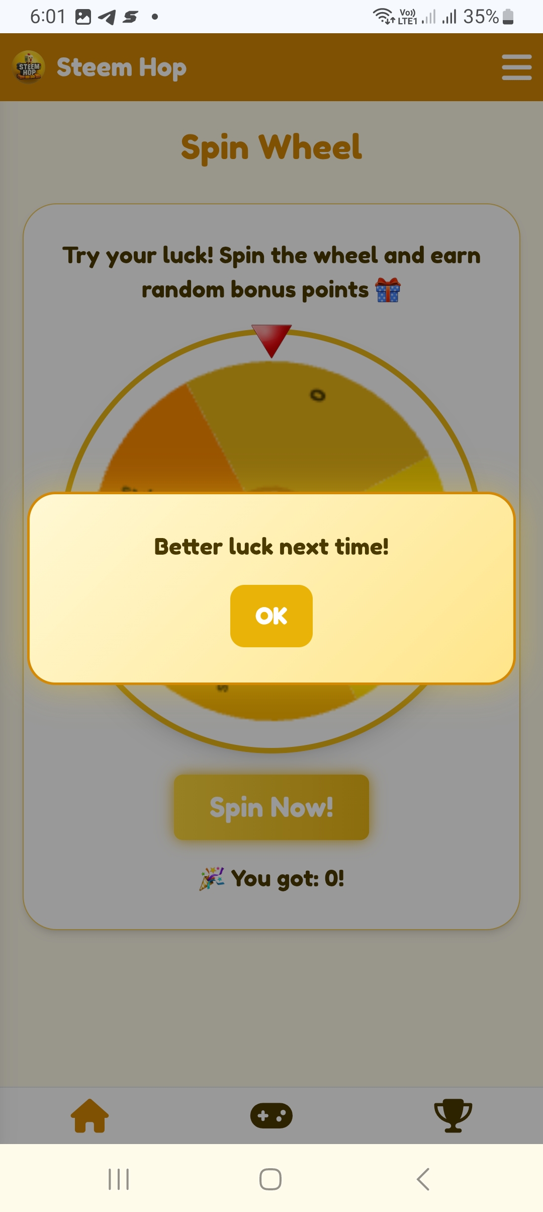 First, I logged in with my username and password. Then I got ten points as a daily reward. Later, I saw that there were 11 hours in a day. And then I clicked on the spin button to spin. From there, I spun. But unfortunately today I did not get any points, I got 0.