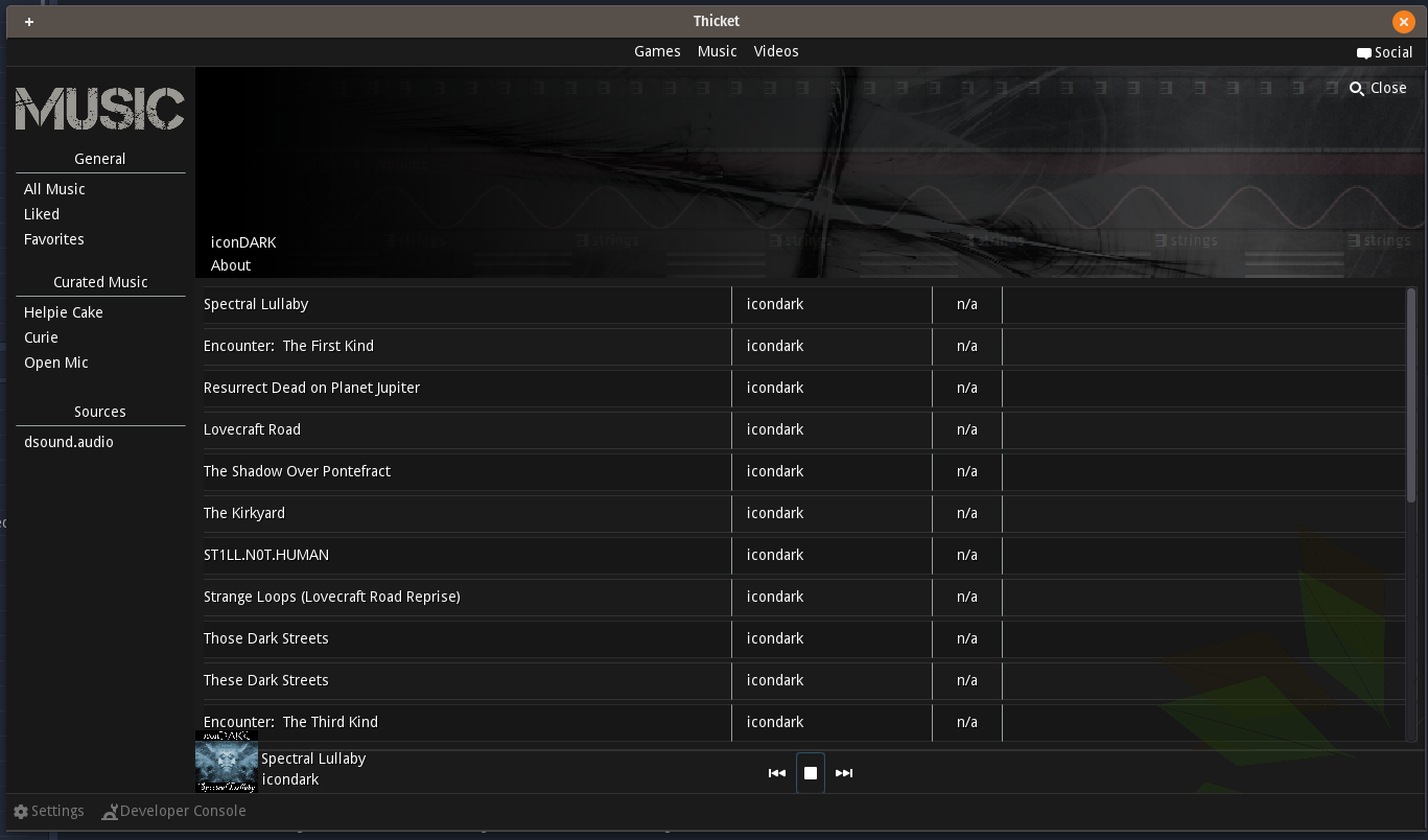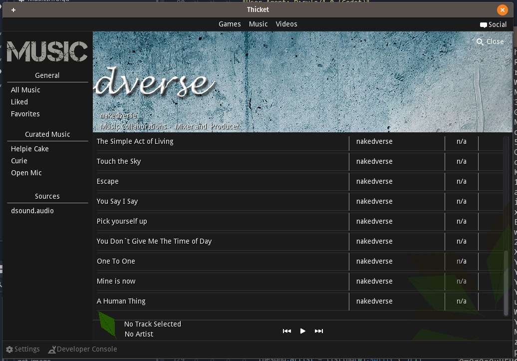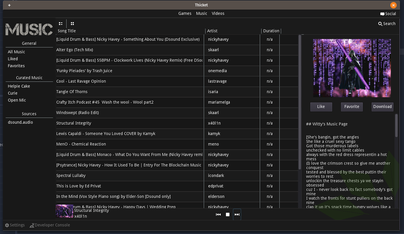 I would like to say thank you to @helpiecake for curating the list I've been using to build the application. I would also like to thank all the musicians on that curated list (@nickyhavey,@skaarl,@meno,@onemedia,@lastravage,@isaria,@mariamegla,@x40l1n,@kamk,@icondark,@edprivat,@elderson,@nakedverse) for making development a musical treat.