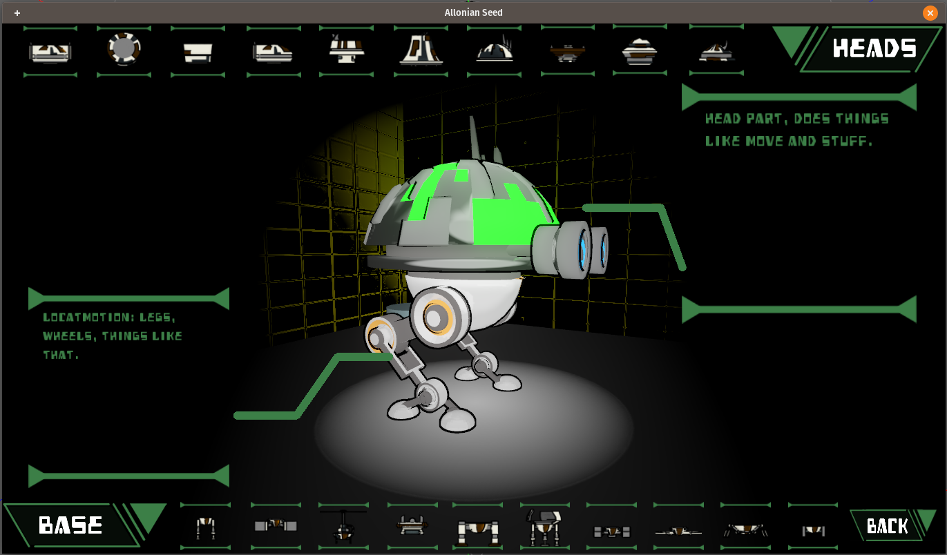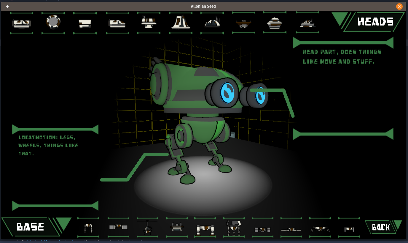 I've started working on the creation of true "Individual bots" and a part of that is not just in the head,body,eyes,and augments, but also in the colors the player chooses to bestow their bots. These colors will be a mix of both mathematical RGB colors but also "skins" that are applied to the parts. I haven't decided if the colors are independent of the part or something a player has to work for. Regardless the above image will not be available but a similar version may make it into the final version.