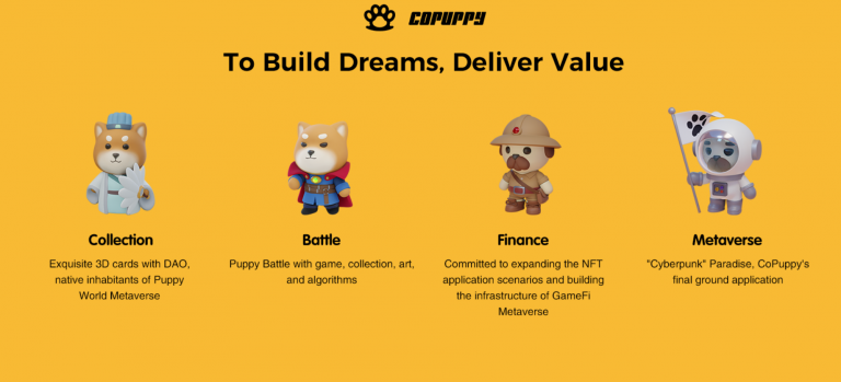 CoPuppy is a decentralized dog program that allows players to engage with different types of GameFi. Puppy acquisition is one of the most important key components of CoPuppy. Battles, NFT loans, as well as other exchanges are among other factors. If you love dogs, you will love them. CoPuppy is a decentralized entertainment community that offers a variety of programs, including collect, conflict, NFT lending, and NFT reviews. CoPuppy is a GameFi Order Information Technology network that provides support such as collecting, fighting, borrowing NFTs and evaluating NFTs. This is a chain of open gaming ecosystem that can be called "CryptoFantastic New Operating System and AI."