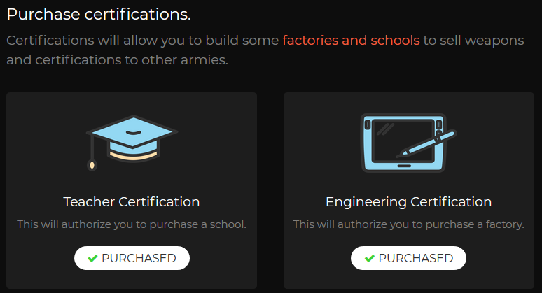 - At army level 1 you are able to buy teacher and engineering certifications.