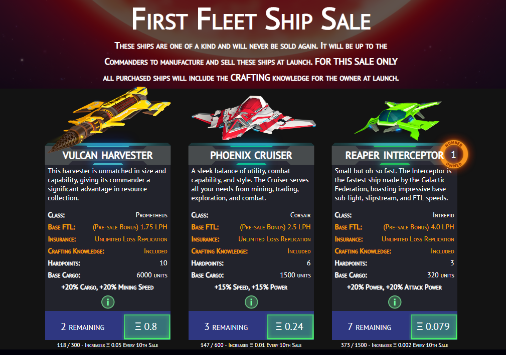 Players can own an unlimited amount starships in their fleet, but only one can be commanded at a time. Each starship can be modified by equipping various modules, such as upgraded weapons or shields. Each starship class provides a boost or buff to a distinct specialization, making some ships better suited for specific tasks. Modules can be acquired from other players in a system’s trading post or crafted using harvested resources. As the player base grows and players continue to mine new resources and craft them into modules, ships, and other items, the growth of the economy gradually shifts from the Galactic Federation into the players’ hands.