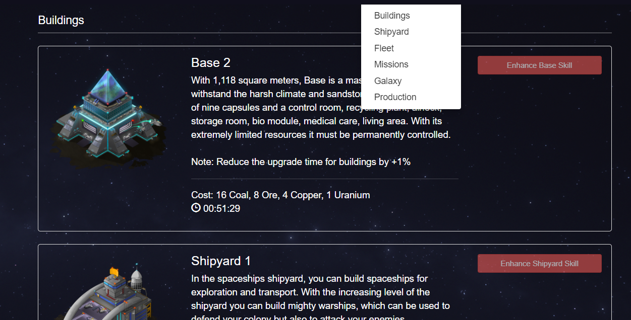 We get 3 menu buttons, one for our account with skills(very important because you must train your skills to build something), shop to buy res and boosts, ranking, and faq (and list of planet but it won't be useful for a long time, and the list of all planet hm if you like to see all same "alfa" planet here you are, but be ready to wait long time for them to load). Then you have "planet list menu" there is one planet at the beginning so don't bother, and planet menu, where you can go to the building site (also shipyard and other but for now aren't very useful). The menu at mobile has to small buttons like for me so it is one more minus.