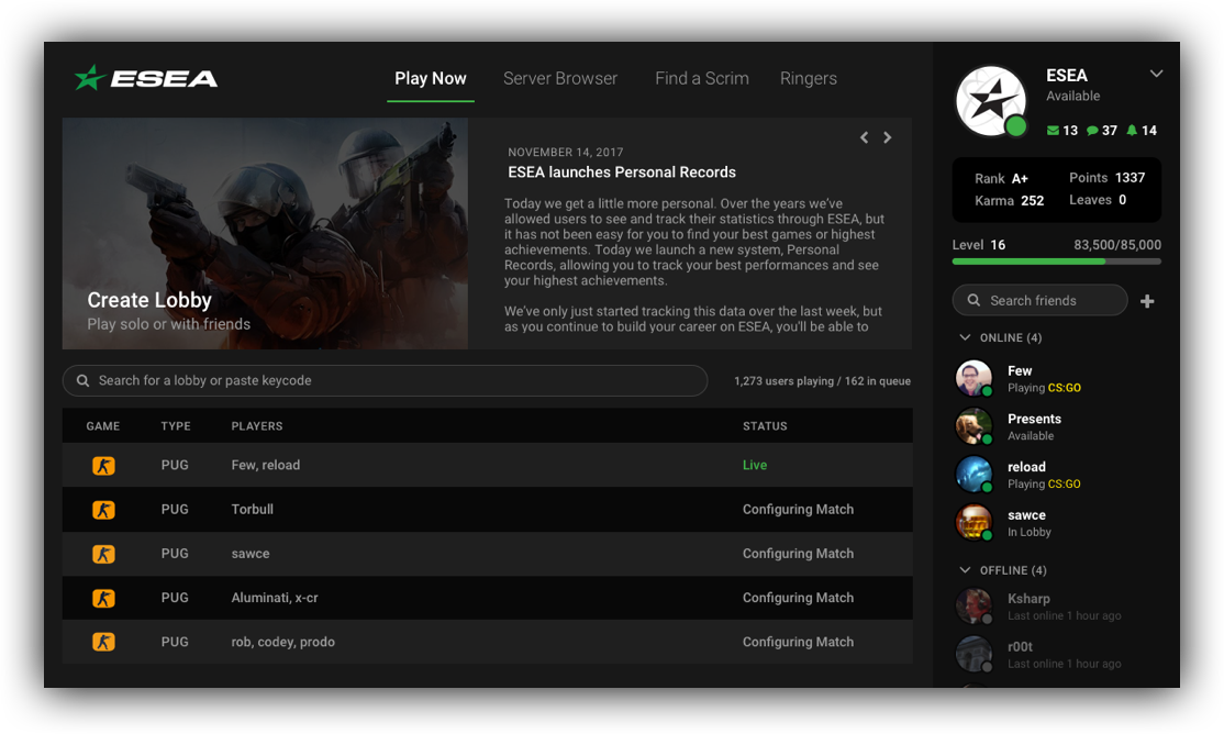 ESEA is a third party matchmaking program that uses the industry leading anti-cheat (ESEA Client) to protect matches. ESEA currently has PUGs, Scrims, Ladders, Events and runs one of the largest open format leagues in the world. Joining ESEA today gives you access to one of the largest gaming communities in the world.
