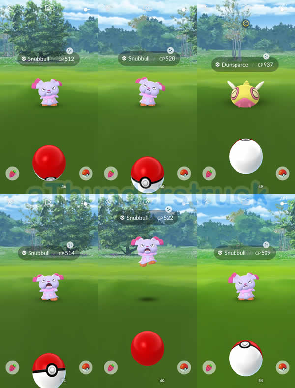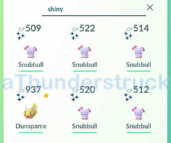 Early on in one of the first steps I was already able to encounter a Shiny Snubbull, which is the first time I encountered one. As I had not encountered a single Shiny so far since its release. After I got 2 Shiny Snubbull from these encounters, I managed to encounter a Shiny Dunsparce!! That one came as so much of a surprise to me! Later on I was able to get a total of 3 more Shiny Snubbull from the encounters, for a total of 5. You can see screenshots of all the Shiny encounters and an overview screenshot below.