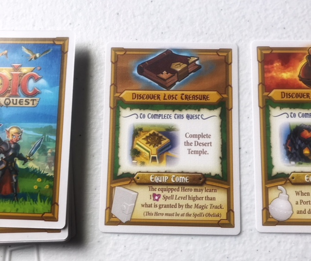 In this example Green needs to Discover the Lost Treasure. To do that Green needs to Complete the Desert Temple and then they get to basically have the ability to learn a spell higher than they could otherwise, by equipping that Tome. (The bottom text)