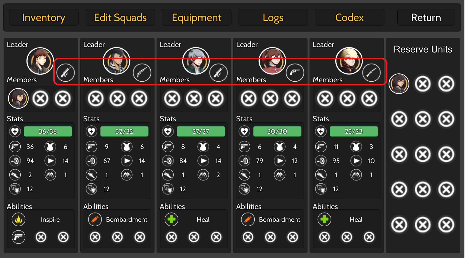 So the new mechanic that I decided to add to the game is squad weapon specialization. The way that it works is that the squad's weapon specialization is determined depending on who the leader of that squad is. So now 3 important characteristics are decided based on the squad leader: stats, special ability, and weapon specialization. What this specialization does, is it restricts the squad to only being able to use a certain weapon type so the play-style of the squad will be more distinct.
