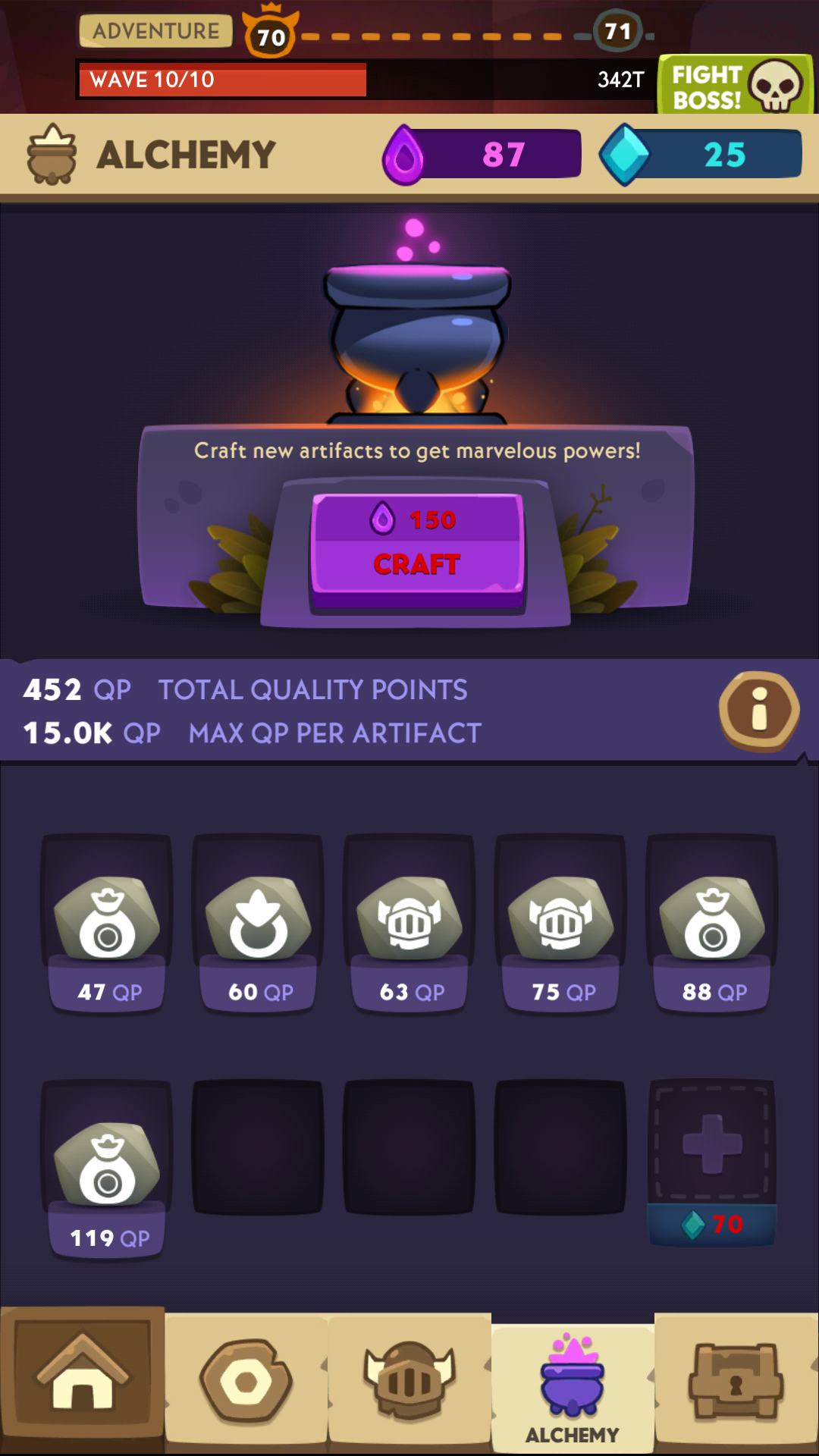 One cool feature of the game is the alchemy system. It's part of prestiging but kind of has it's own mechanic. You can use your Alchemy points to craft artifacts. The artifacts are randomly generated buffs for your party. Each artifact has a quality amount which you can spend alchemy points to attempt to upgrade into new randomly generated artifacts. I'm still learning and don't have a ton of alchemy points to play with but I'm liking the system so far and find it to be a nice little twist to the normal prestiging systems.