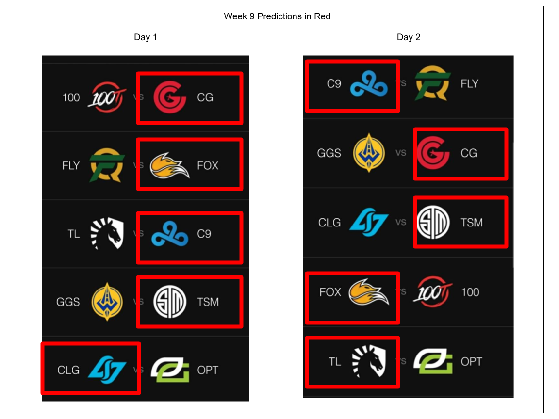 Another pretty decent week for my predictions. With one pretty big upset. Fox had an 0-2 weekend. I predicted the Clutch win, mainly hoping, but didn't see the CLG one coming. Clutch didn't manage the 2-0 I was hoping for, but I'm proud they took down Fox. The field is still so volatile. Clutch has beat TSM a couple times now, but loses to TL, who has just lost to TSM. Fox randomly dropping games to different teams across the spectrum. Do you think the last week of regular season will firm up the standings a bit more? Will there be any ties to break for playoff standings?