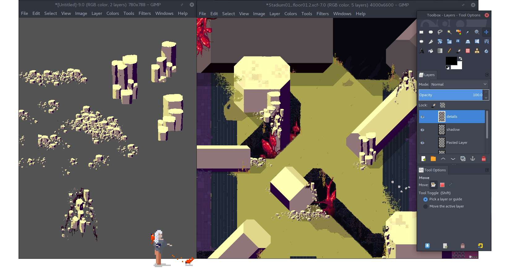 From here on out we're down to grinding assets. Gimp does a great job of pushing pixels, scaling, and the occasional layer-effect to shape our world. Sword & Sorcery and Hyper Light Drifter have shown how a modern pixel-aesthetics can carry the nostalgia of the 90s, without feeling like a blast from the past.