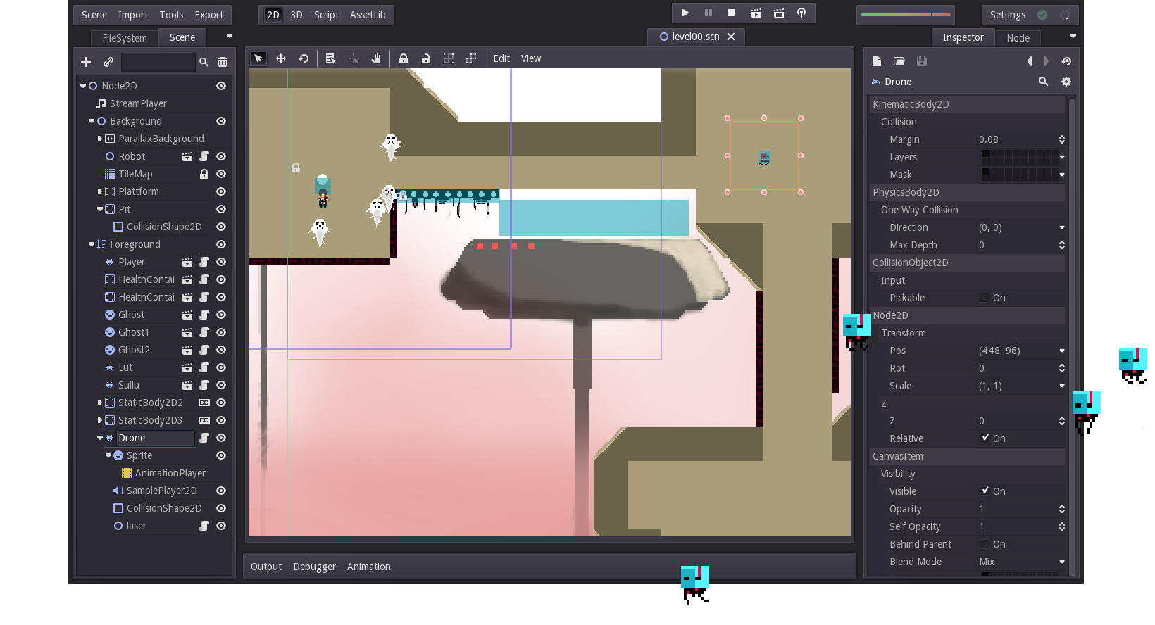 Every layer of detail gets chopped into sprite-sheets that make their way into Godot as backgrounds, objects, destructibles or enemies.