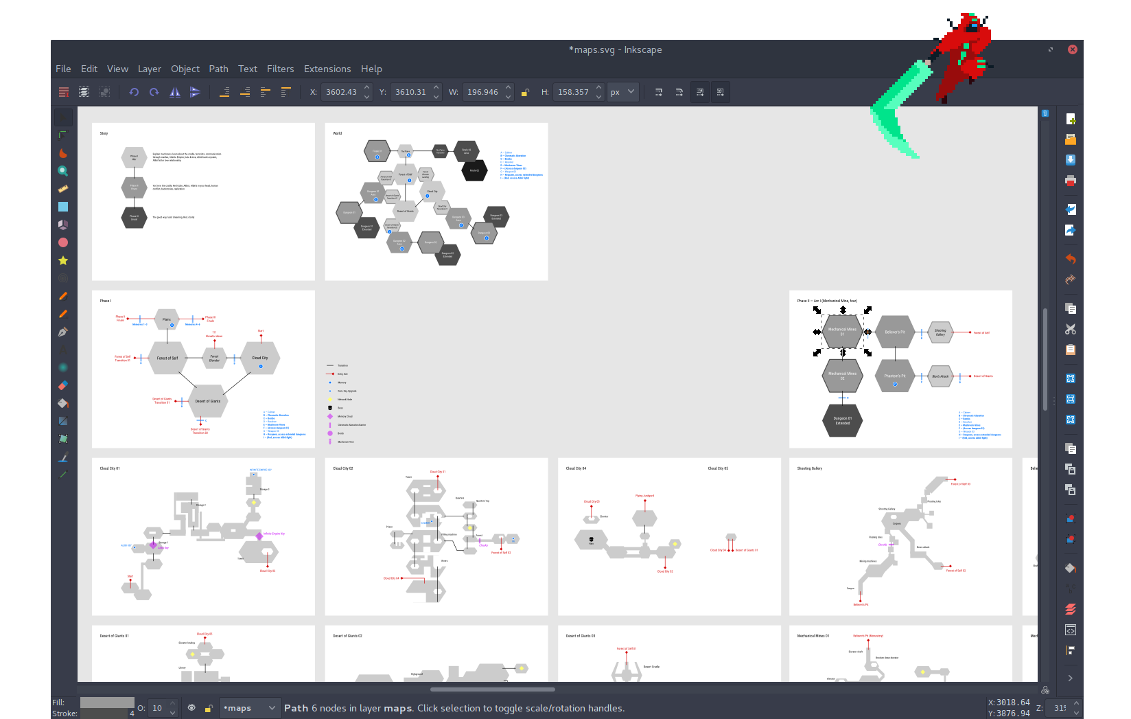 I’ve been using Inskscape since it was still called Sodipodi. I start by drawing a series of hexagons titled “Cloud City”, “Divided Sea” or “The Plains” that represent a level or scenario of the story. Then each level gets refined into a set of connected maps. After just 2 days, we were able to establish a visual understanding of the whole game and its critical path through plenty gray boxes on white paper.